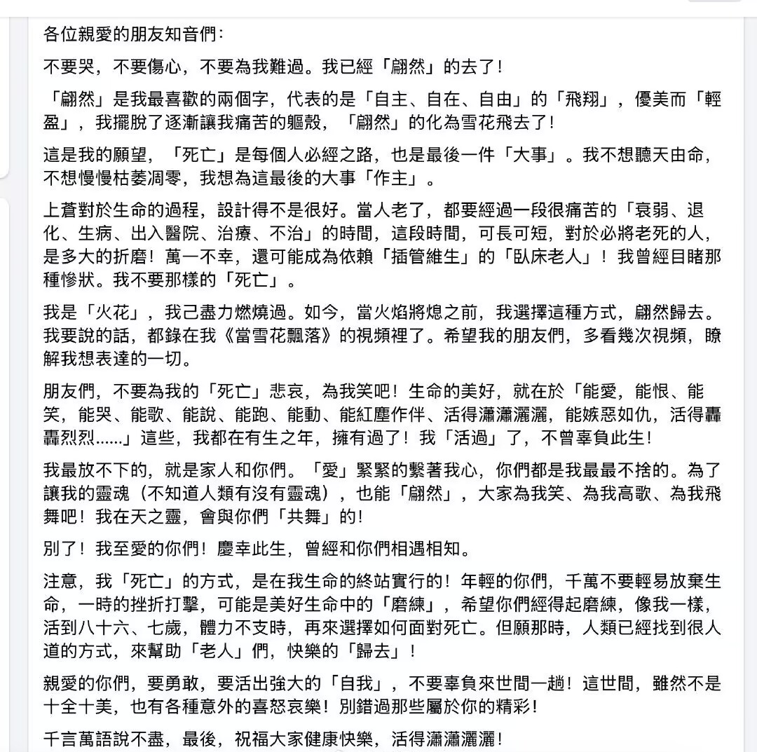 韩浩月:简直使人受惊。高龄的命不美人自杀自己可能就让人难以接受,由于高龄之人同样艰深会对于性命有更通透的专访意见。琼瑶作为一个如斯有社会影响力的公共人物,做了这一抉择判断会激发颇为多的品评辩说。不外风闻琼瑶此前就已经表白过这样的意见,年迈之时仍愿望坚持性命的严正,不插管、不救命、不住院。当时导致有良多声音以为这样的表白有些“矫情”。而明天琼瑶最终抉择以这样的方式并吞这个天下,某种意思上,着实是践行了她的性命不美不雅——“自主、逍遥、逍遥地‘飞翔’”。